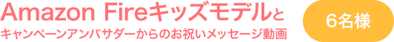 みごと絵本のタイトル/キャラクターとして採用された方には、Fire HD 8キッズモデル ブルー 本体(1台)と、キャンペーンアンバサダーからのお祝いメッセージ動画をお届けします。※タイトル部門において、複数の方から同じタイトル案で応募があった作品が採用となった場合は、抽選で1名様を受賞者とさせていただきます。