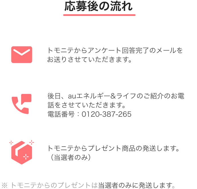・過去「auエネルギー&ライフ協賛プレゼントキャンペーン」に応募いただいたことがある場合、ご応募いただけません。