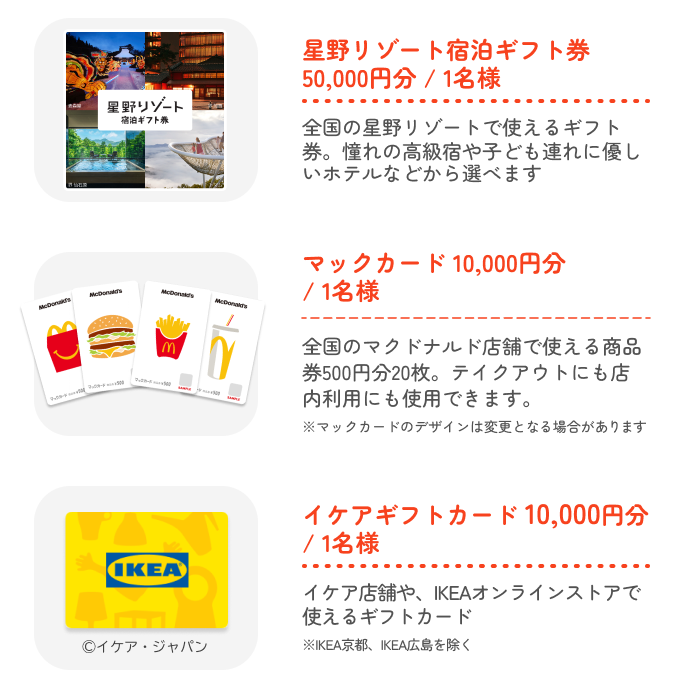・応募期間の途中で、本応募要項の内容又はアンケートの設問が変更となる場合があります。また、応募期間の途中でキャンペーンの協賛企業が追加又は変更される場合があります。