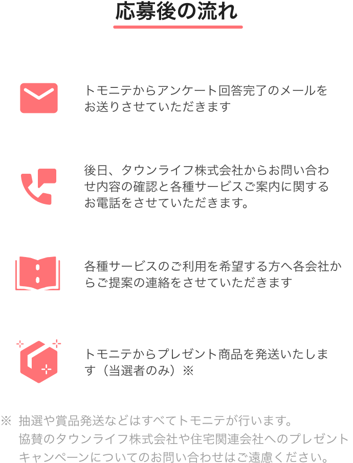 ・賞品の抽選は、本キャンペーンのほかトモニテ(株式会社エブリー)が主催する、以下の協賛プレゼントキャンペーンの応募者全体から行います。